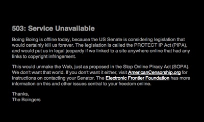 Posted: 18/01/2012 Filed under: Censorship | Tags: Boing Boing, PIPA, SOPA, Wikipedia 3 Comments