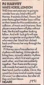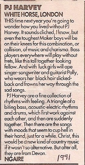 I’m glad PJ Harvey has won this year’s Mercury Prize. I’ve not heard every album that was nominated, but I have heard “Let England Shake” and it’s a pretty special collection of songs. I’m not especially a fan of Polly Harvey as it goes, but my fellow Melody Maker writer and one-time flatmate Ngaire Ruth was one of her very earliest champions. She wrote the first review of PJ Harvey to appear in the national music press – a live review from the White Horse in London in 1991. Click on the clipping for a larger version if the text is too small for you to read.