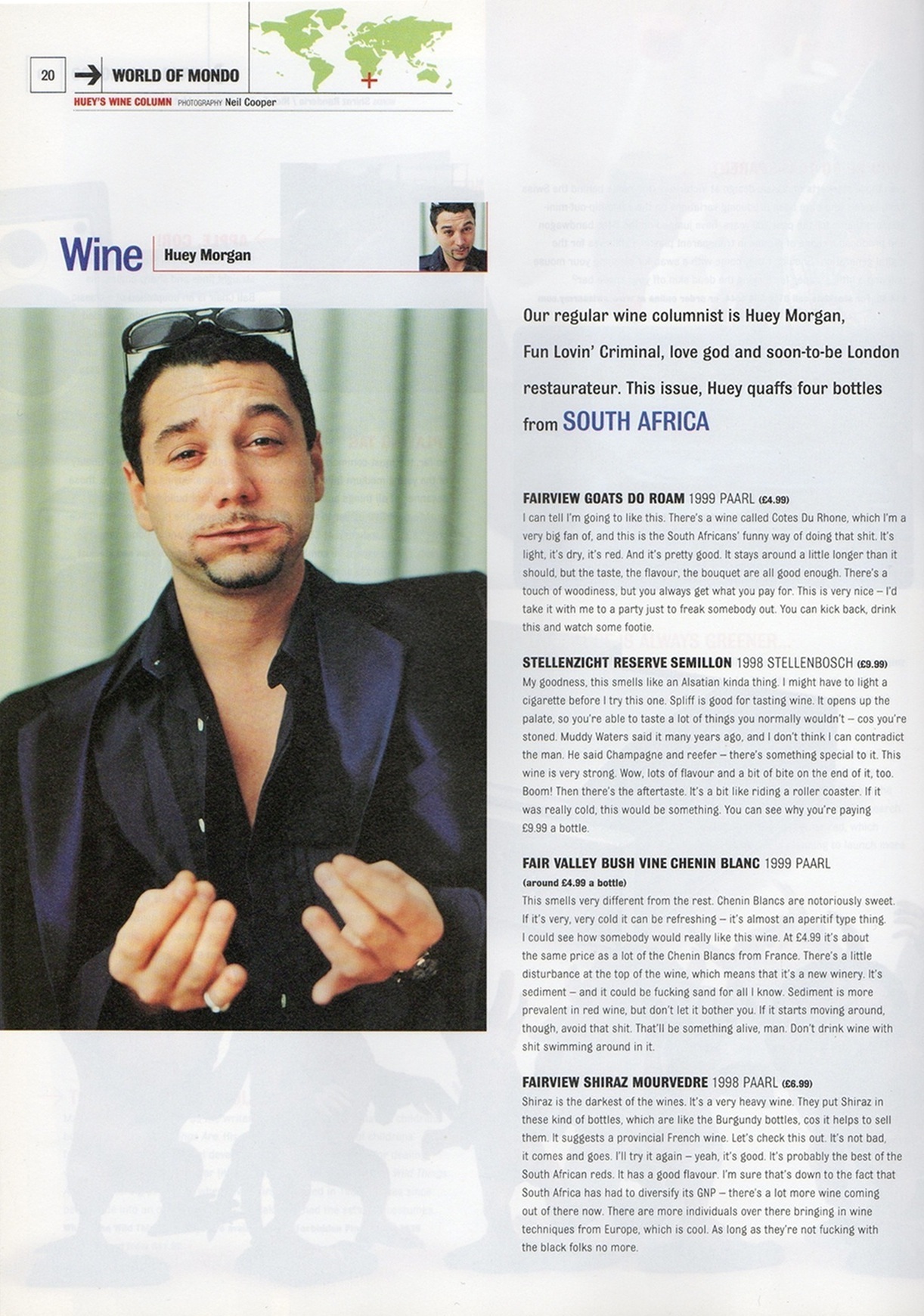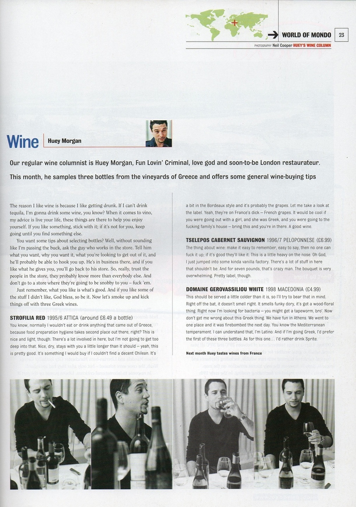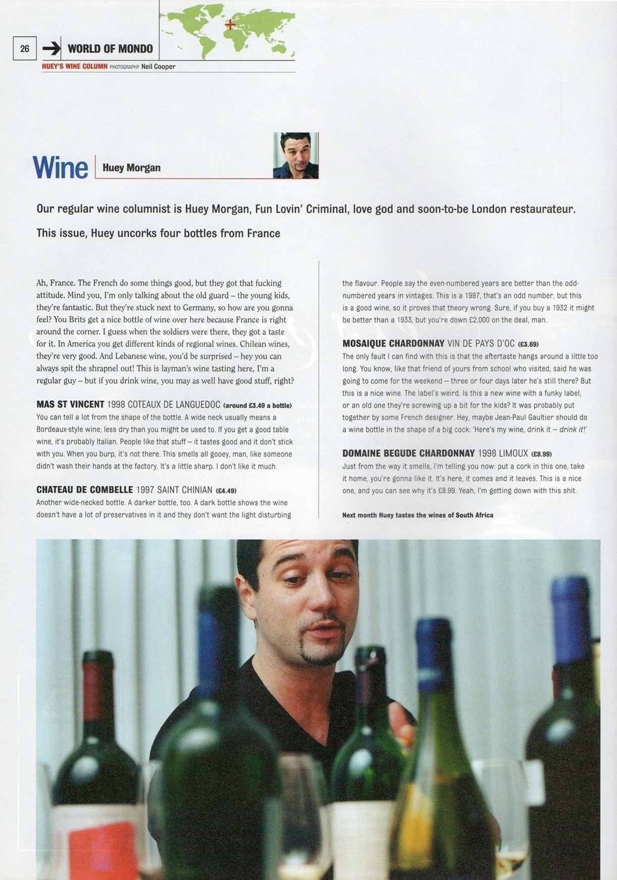 Way back when, I was the editor of a magazine called Mondo. It wasn’t around too long (2000 and 2001), which was a pity because I think we had some corking editorial ideas. But then I guess I would say that. Anyway, one of our regular features was Huey’s Wine Column – a wine column by Huey Morgan of the Fun Lovin’ Criminals, who’s now maybe best known in the UK for his shows on BBC Radio 2 and Radio 6 Music. Huey didn’t pen his column himself, mind. It was ghost written by Mondo deputy editor Mark Wernham, who would fill a big box with bottles of wine, grab the office tape recorder, and meet with Huey at some secret location every month. That was generally the last we’d hear from Mark for a couple of days.
